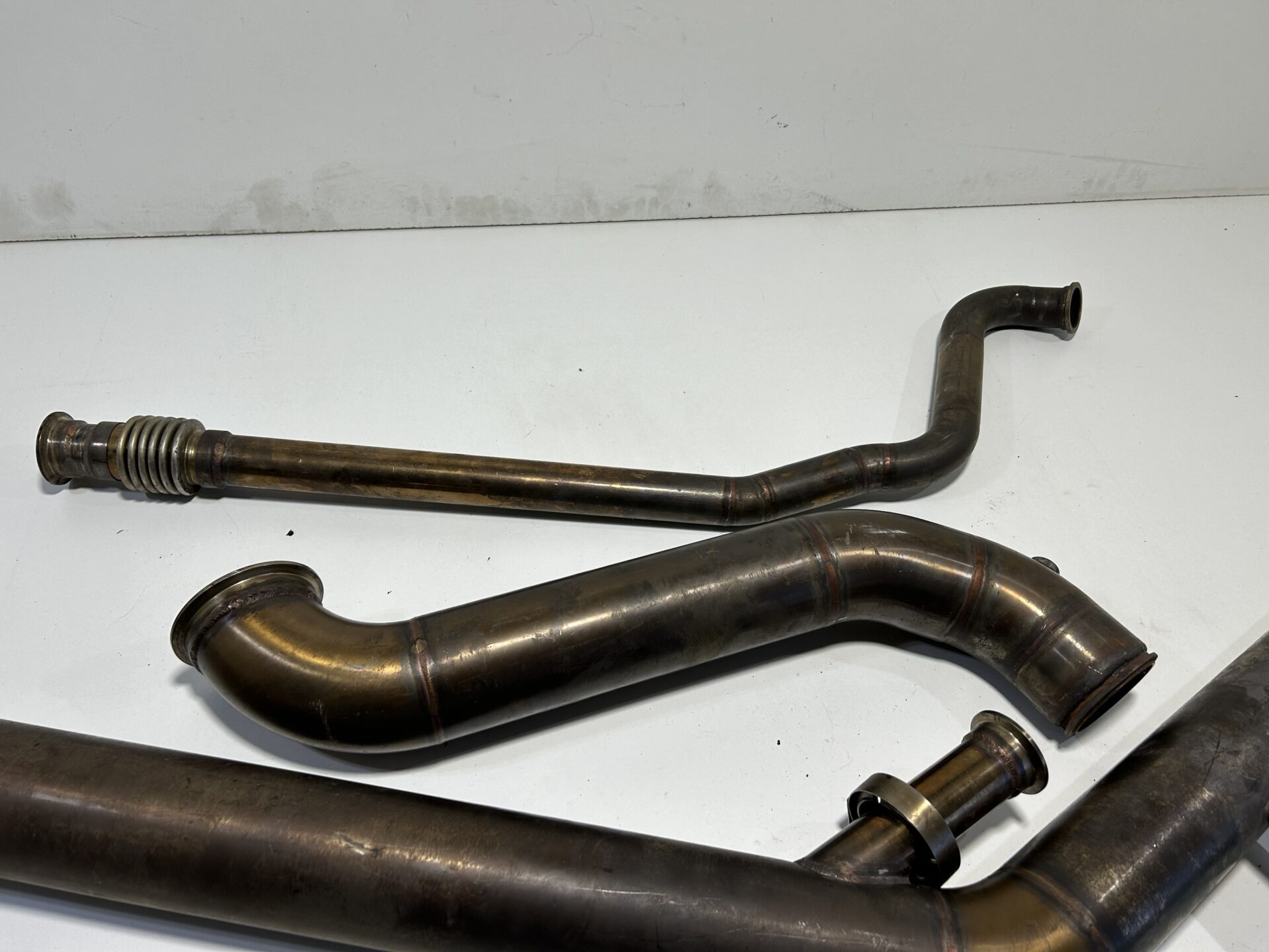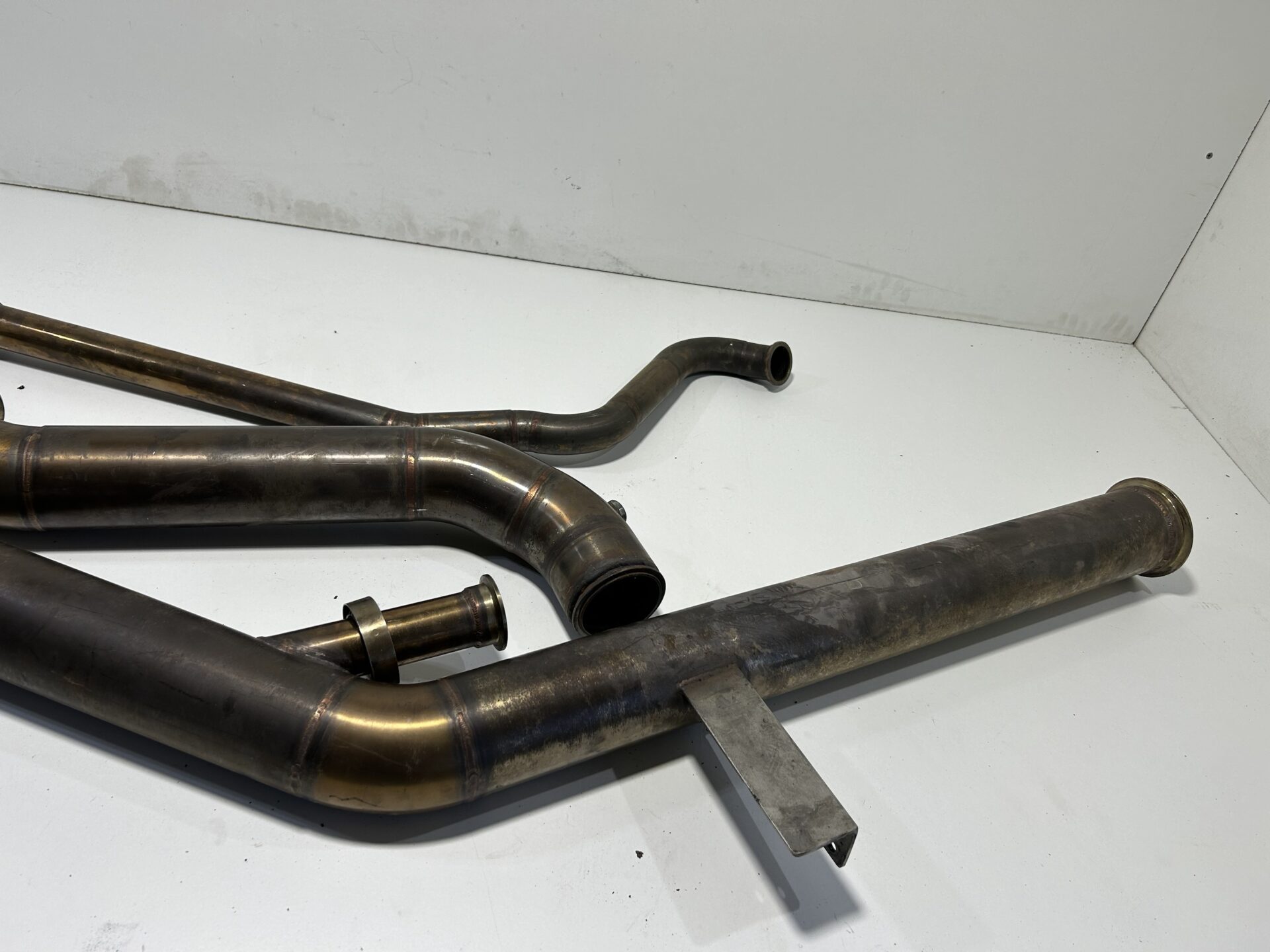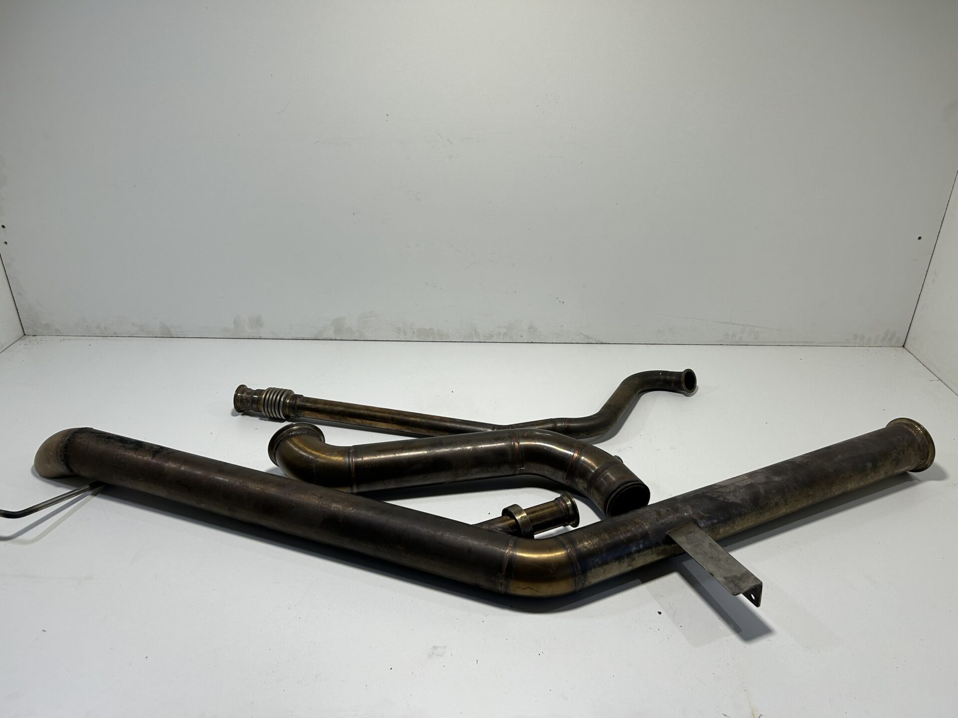 Exhaust exits just in front of the rear wheel, Comes with dump pipe and plumb back screamer pipe.